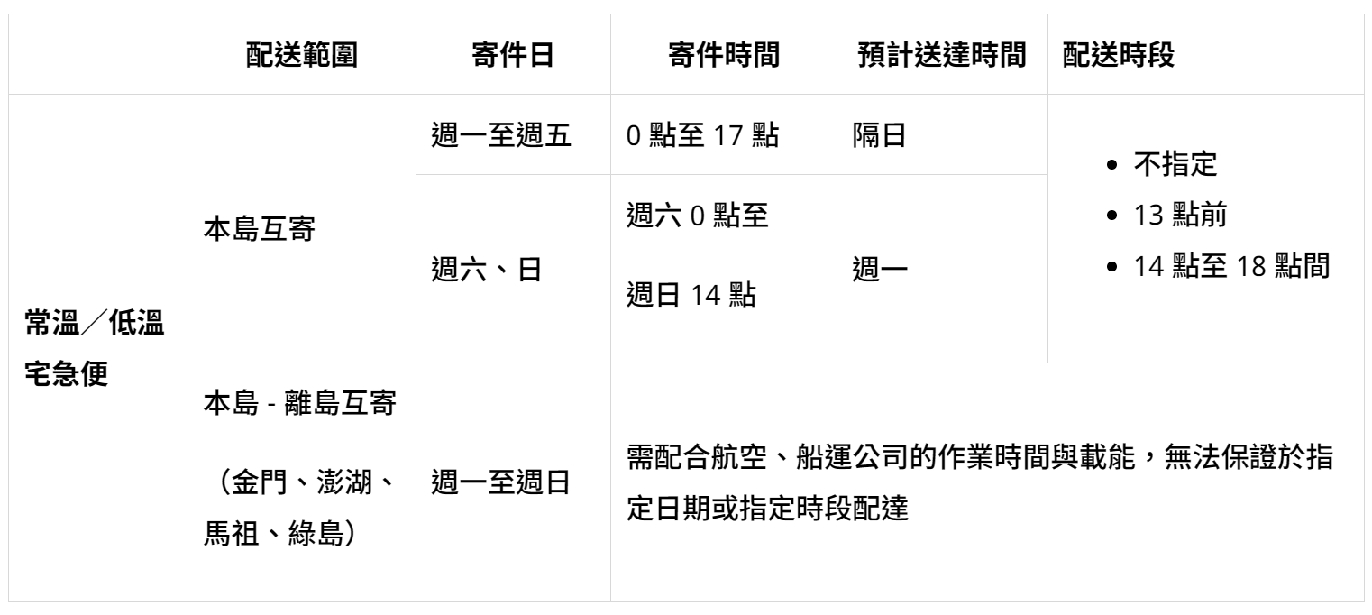 * 離島地區若遇天候、海象、船班年節停航及船班歲修等不可控之因素,恕無法指定希望配達日及時段